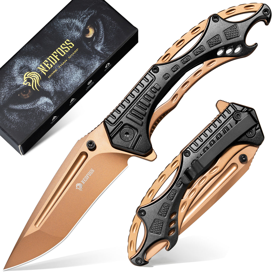 NedFoss CHEETAH Folding Pocket Knife, Premium Gold D2 Steel Blade Survival Knife, Unique Aluminum Handle with Skeletonized Frame, Pocket Clip, Cool Pocket Knives for Men Gift