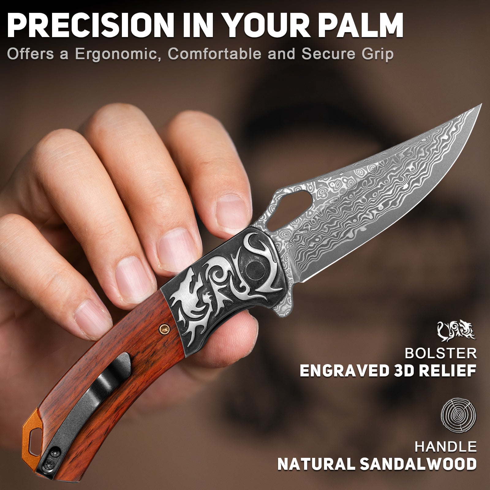 - BEAUTIFUL SANDALWOOD HANDLE: A low-key style wood handles keep things classy, and make a perfect complement to the swirls Damascus blade. With Gorgeous Dragon embossing bolster, this pocket knife is a great option for a Gentleman's Knife.