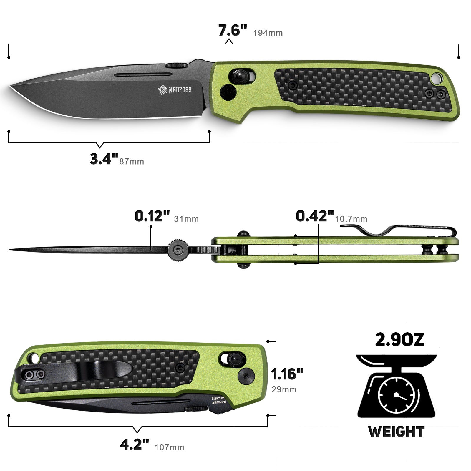 Lightweight Aluminum Handle – Aviation-grade aluminum with green finish and carbon fiber inlay provides a sleek look, ergonomic comfort, and a secure grip without extra weight.